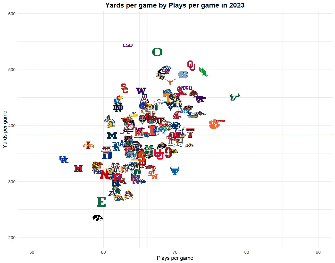 Third, plays per game is 100% influenced by a team’s defense. Further, it’s not just a matter of whether your defense is effective or not. If your defense is prone to getting ball-controlled, adapting a “bend-but-don’t-break” mentality, this will tangibly result in less plays run by your offense, regardless of whether your defense is actually getting stops in the redzone. However, if your defense is more prone to giving up explosive plays, then your offense will actually run relatively more plays per game (think Kliff Kingsbury Texas Tech). Though I still believe this visualization is very informative and digestible, it’s important to be aware that there’s some nuance it doesn’t capture.