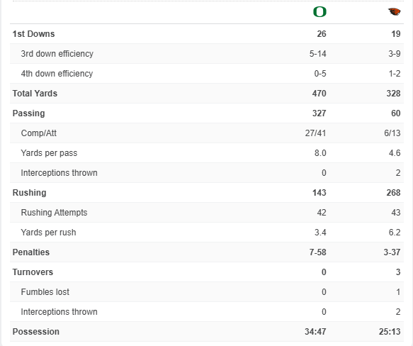 On a random note, while I couldn’t fit it all into the notes column, that Oregon State vs. Oregon game has one of the weirdest box scores I’ve ever seen. Oregon won in nearly every statistic, but the game was decided on fourth downs: