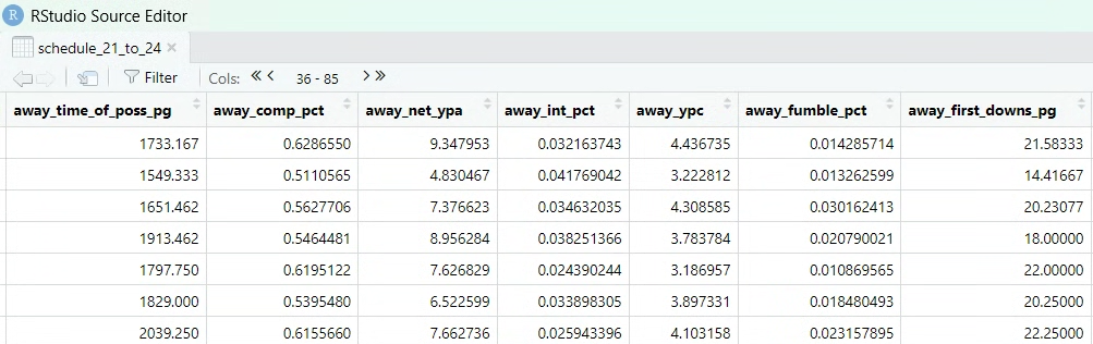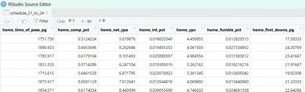 Next, I scraped all of the season statistics3 for each school and performed a left join on the data frame containing regular season games. Determining the structure for this combined data frame took a lot of thinking and researching different methods, but I ultimately decided on having both home team and away team statistics within one row. These were designated accordingly:
