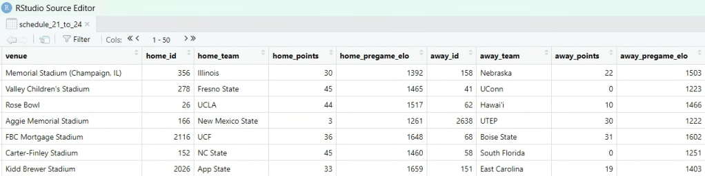 Regarding cfbfastR, this package has been extremely helpful and makes it easy to scrape tons of up-to-date college football data. Carrying out this passion project would not have been possible without it and I highly, highly recommend it to anybody looking to get into sports analytics. Using cfbfastR, I was able to scrape all regular season games between FBS schools1 from 2021 to 2024. This contained single-game information; things like the box score, team statistics, crowd size, and so on. Additionally, I filtered out neutral site games, as I wanted to keep the data as uniform as possible.2