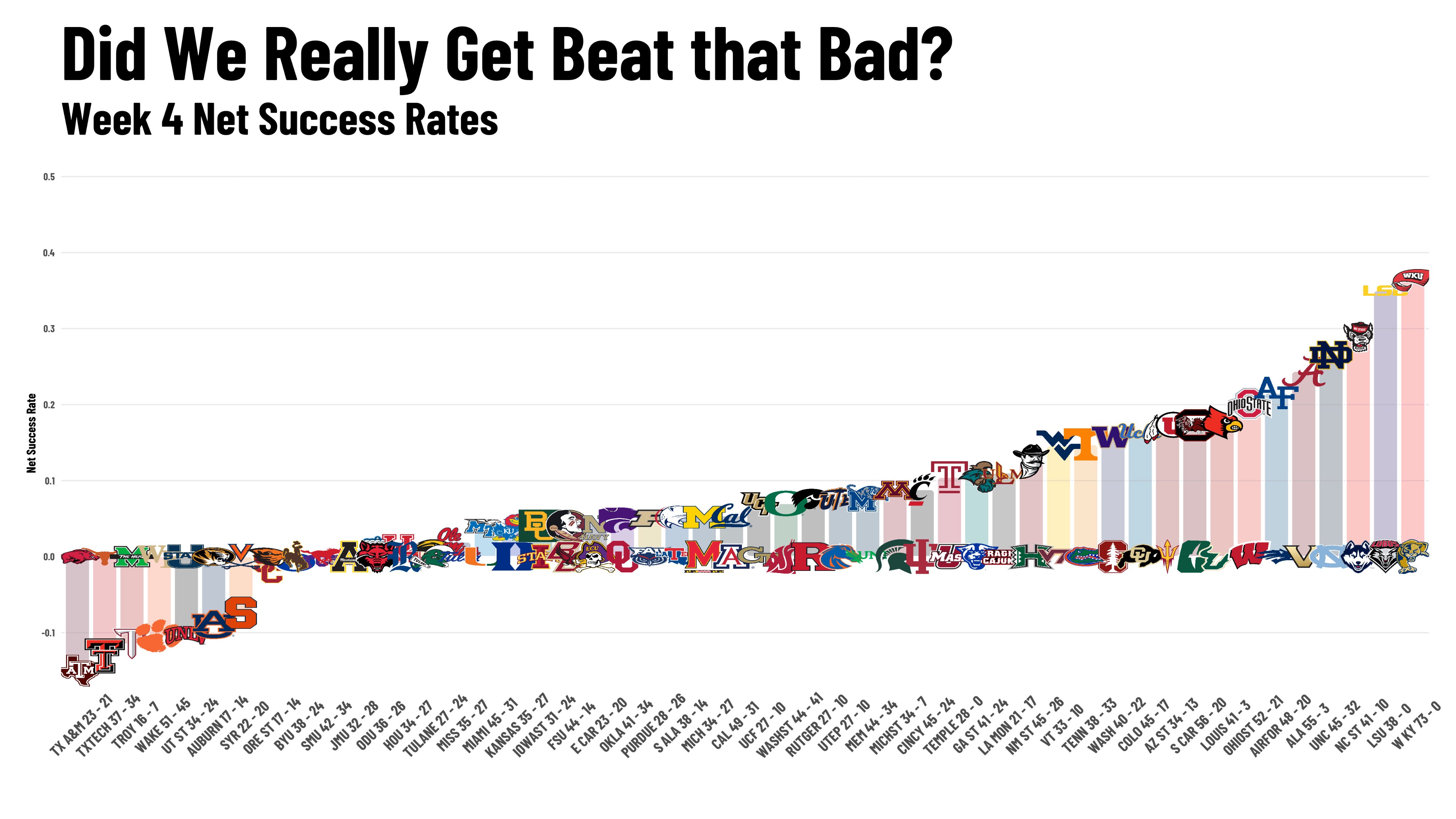 One of the most eye-opening statistics I’ve seen, a statistic which actually got me interested in advanced analytics, is Parker Fleming’s (@statsowar) weekly aggregation of Net Success Rates. After enduring a brutal watch for my Longhorns @ Texas Tech in 2022, I came away from the game feeling like we had won down-to-down, but we somehow still lost (largely thanks to Tech completing 6 of 8 fourth-down attempts). This tweet captured why it felt that way: