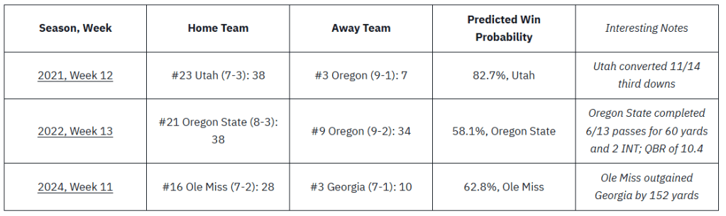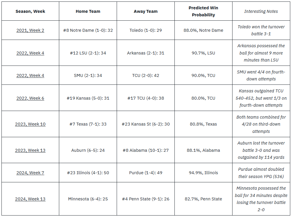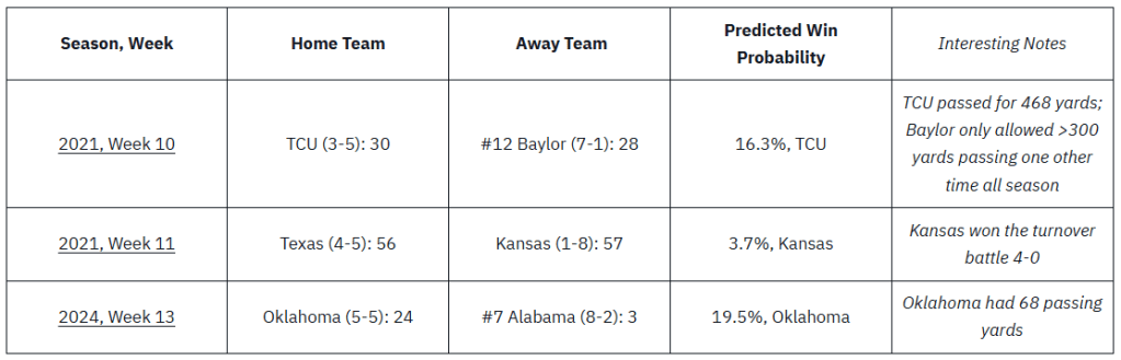 Here are some of the biggest upsets from the model’s perspective; games that absolutely should not have had the outcome they did. These games were also only selected if they were in Week 8 or later of their respective seasons.
