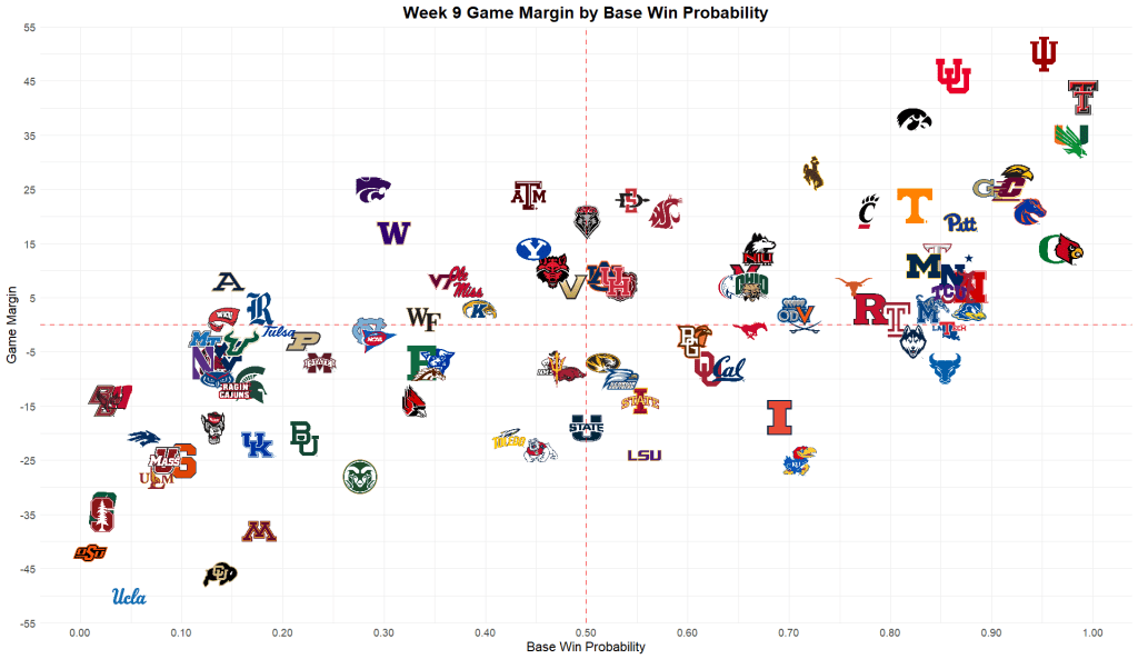 I don’t typically include this as a section, but the Oklahoma State @ Texas Tech game was rated as 99.00% base, 99.34% slimmed in favor of Texas Tech, which is the highest I’ve ever seen the win probabilities for either version of the home/away model.
