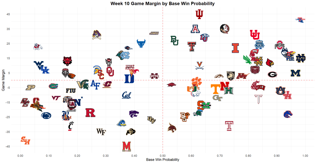 No updates other than an unprecedented week of failure by the model. This was particularly shocking as, by this point in the season, I expected teams to have statistics that would serve as strong indicators of their future success (given the number of conference games played at this point in the year)1. This sort of result is something I would have expected much earlier in the year, but to see it in week 10 is shocking.